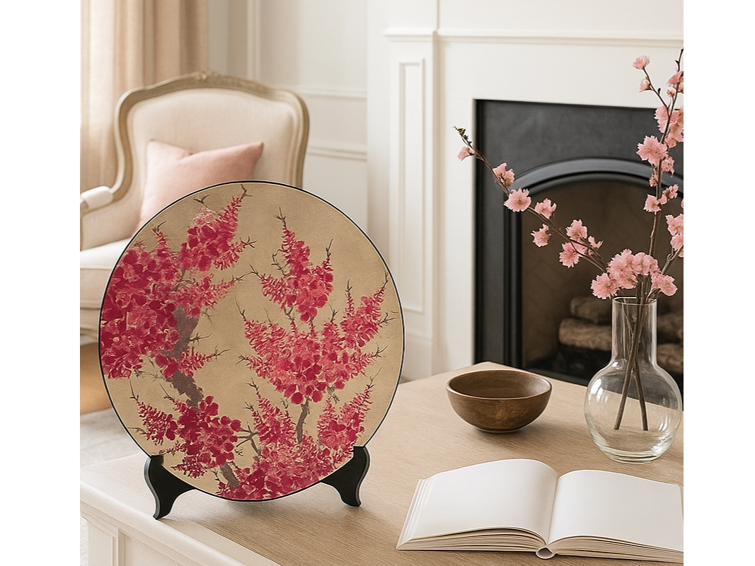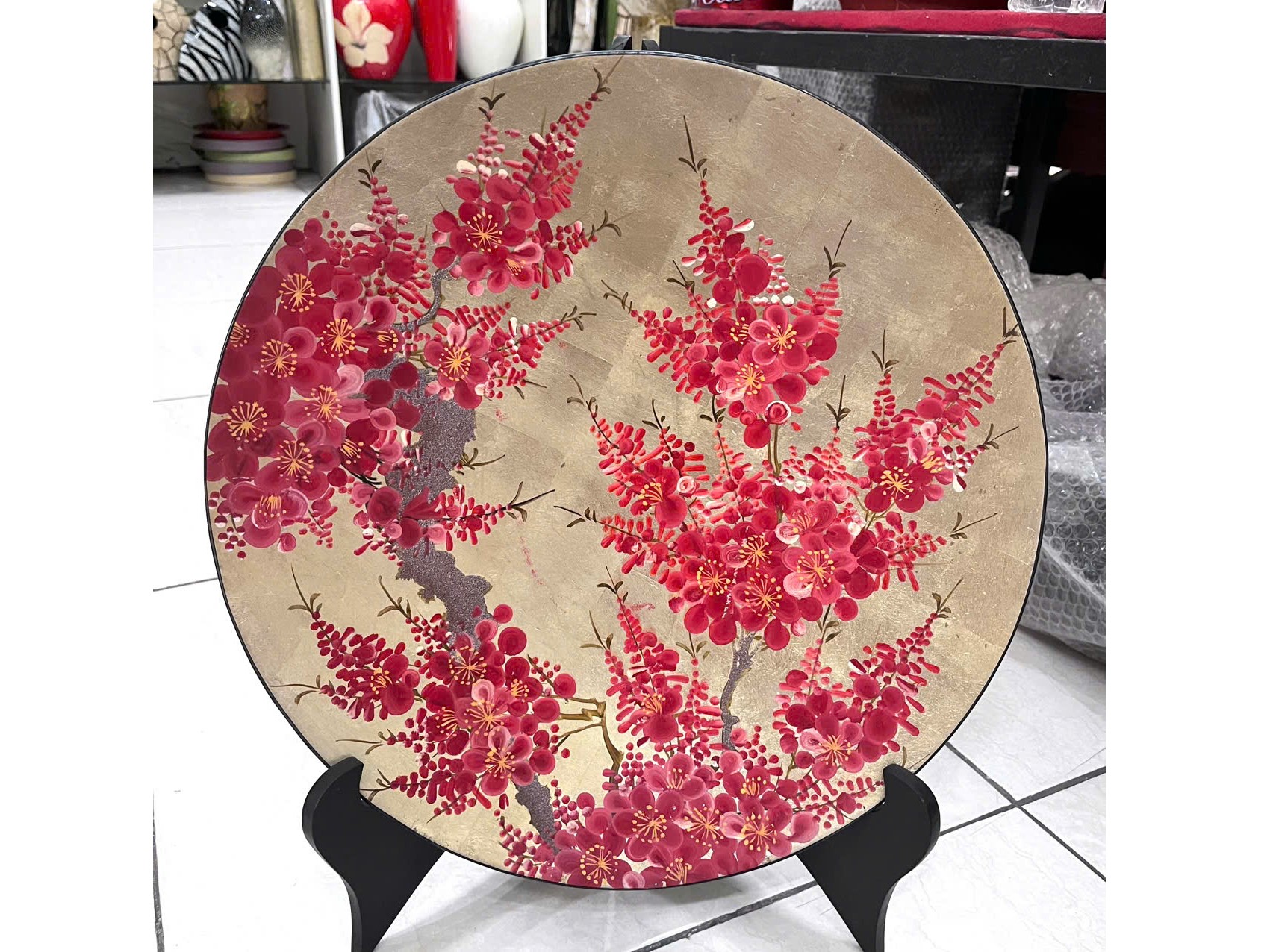 [Loại có viền] Tranh dĩa sơn mài – HOA ĐÀO- Nền dát vàng/ bạc cao cấp – Size 35 cm