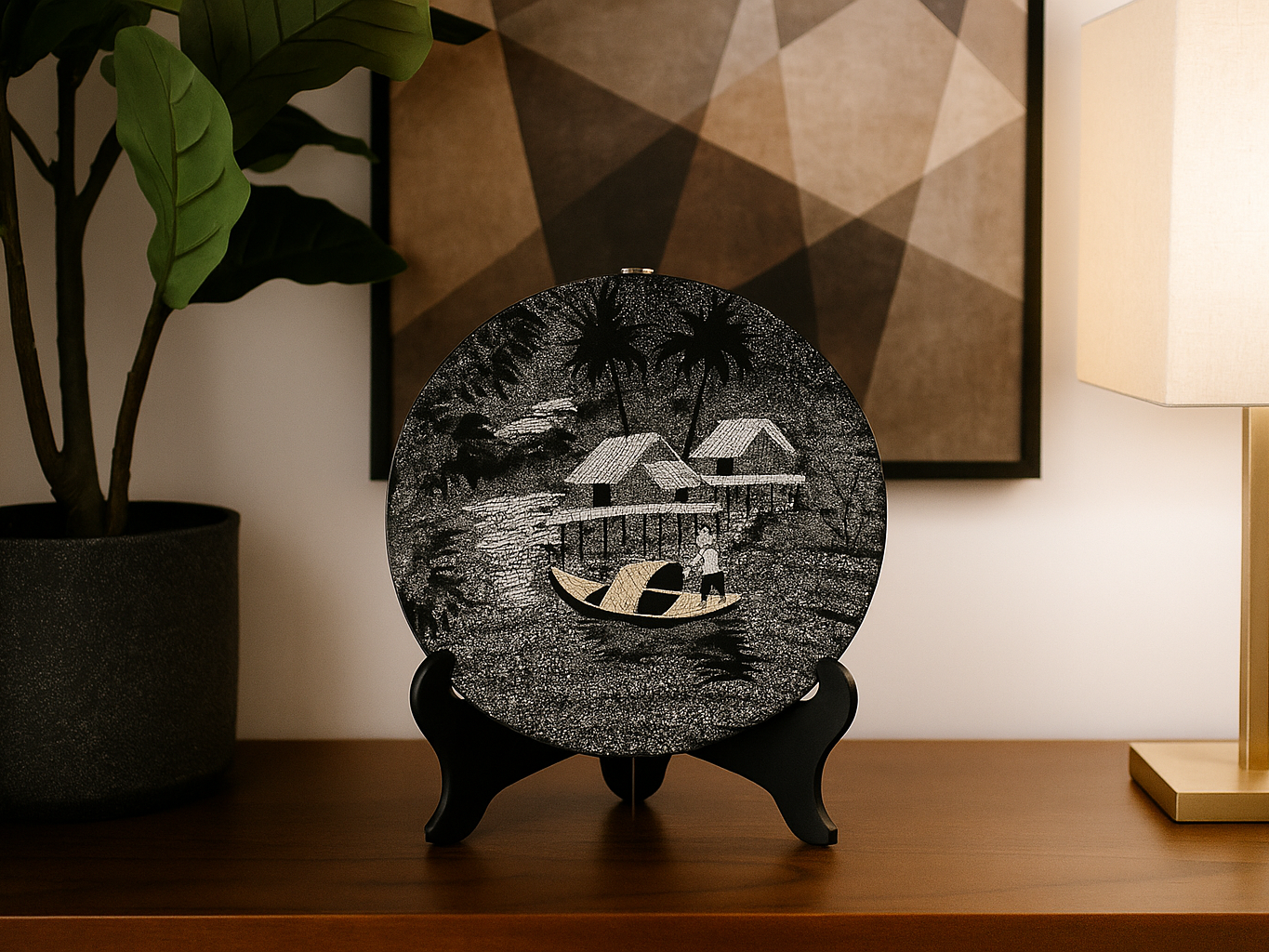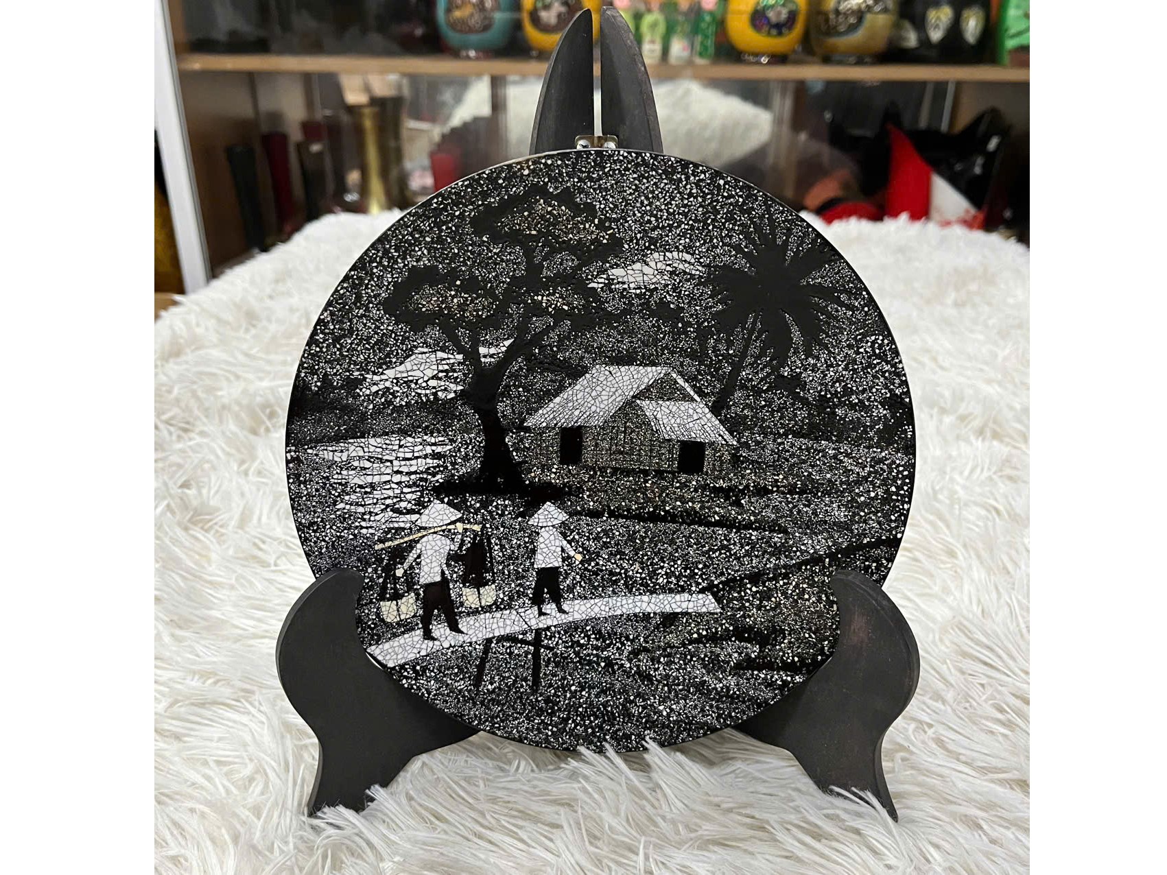 Tranh dĩa sơn mài – Đồng Quê & Cô Gái Áo Dài Việt Nam- Khảm trứng trắng đen