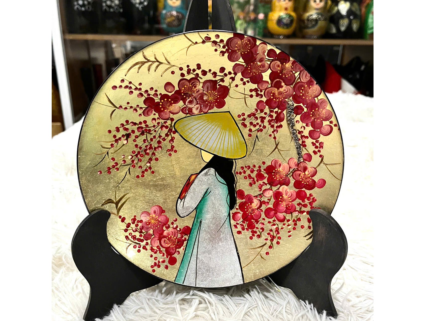 Tranh dĩa sơn mài – CÔ GÁI HOA ĐÀO- Nền dát vàng/ bạc cao cấp