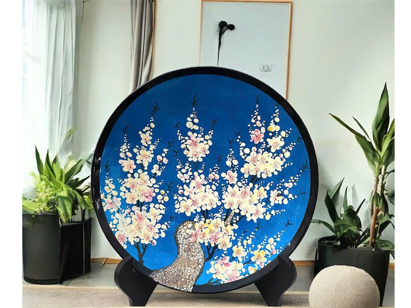Tranh dĩa sơn mài – HOA ĐÀO- Nền xanh cao cấp – Size 35 cm