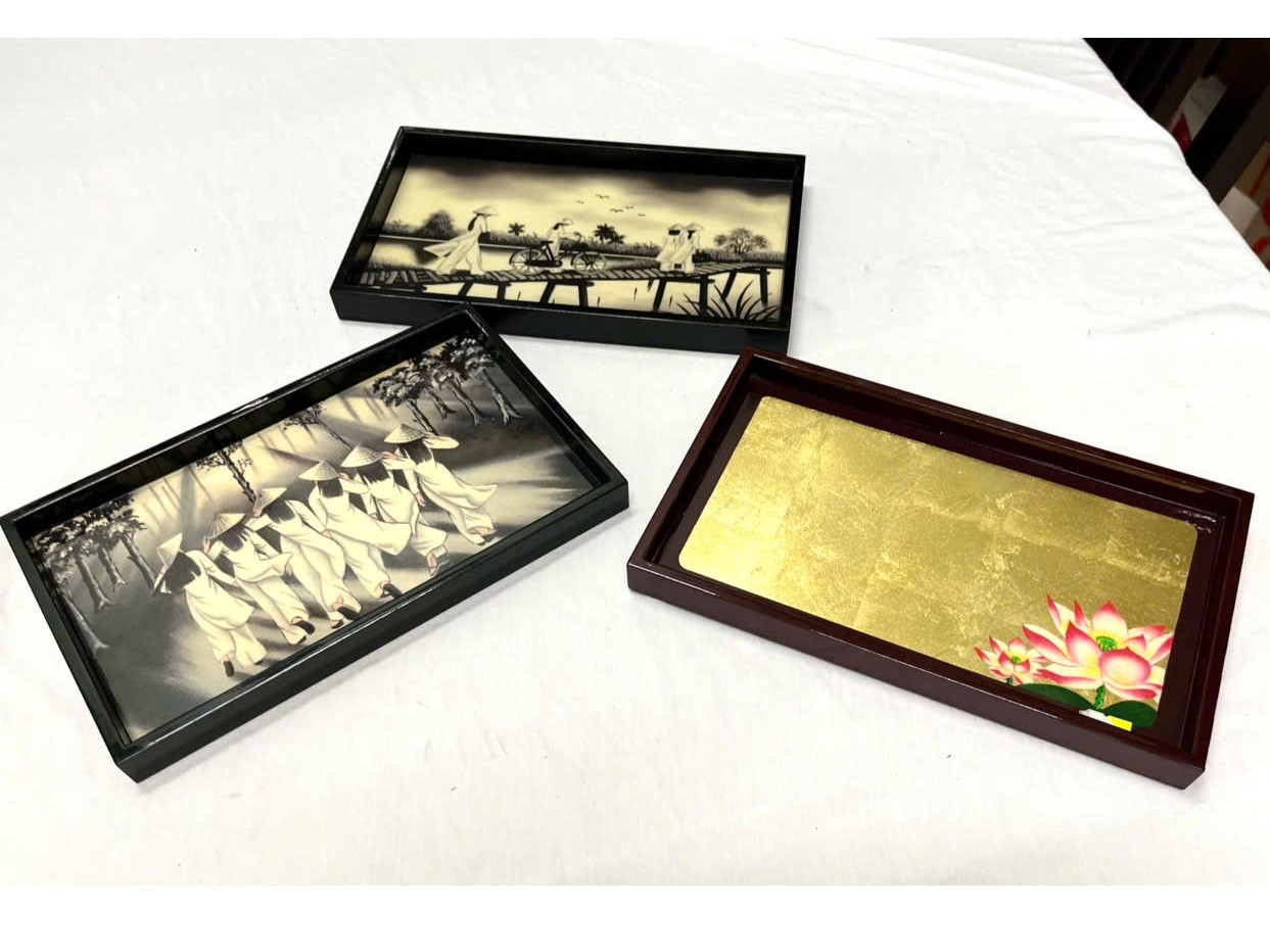 Tranh dĩa sơn mài – Đồng Quê & Cô Gái Áo Dài Việt Nam- Khảm trứng trắng đen