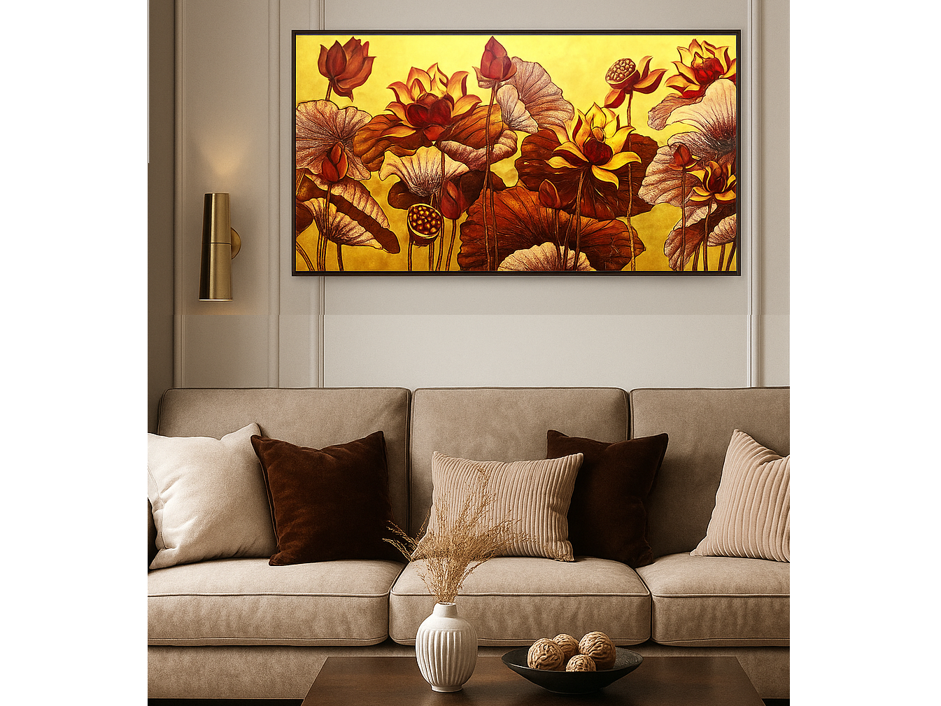 🌸 Tranh Sơn Mài Hoa Sen – Size 80×160 cm – Nền dát vàng cao cấp / Tỏa sáng không gian sống
