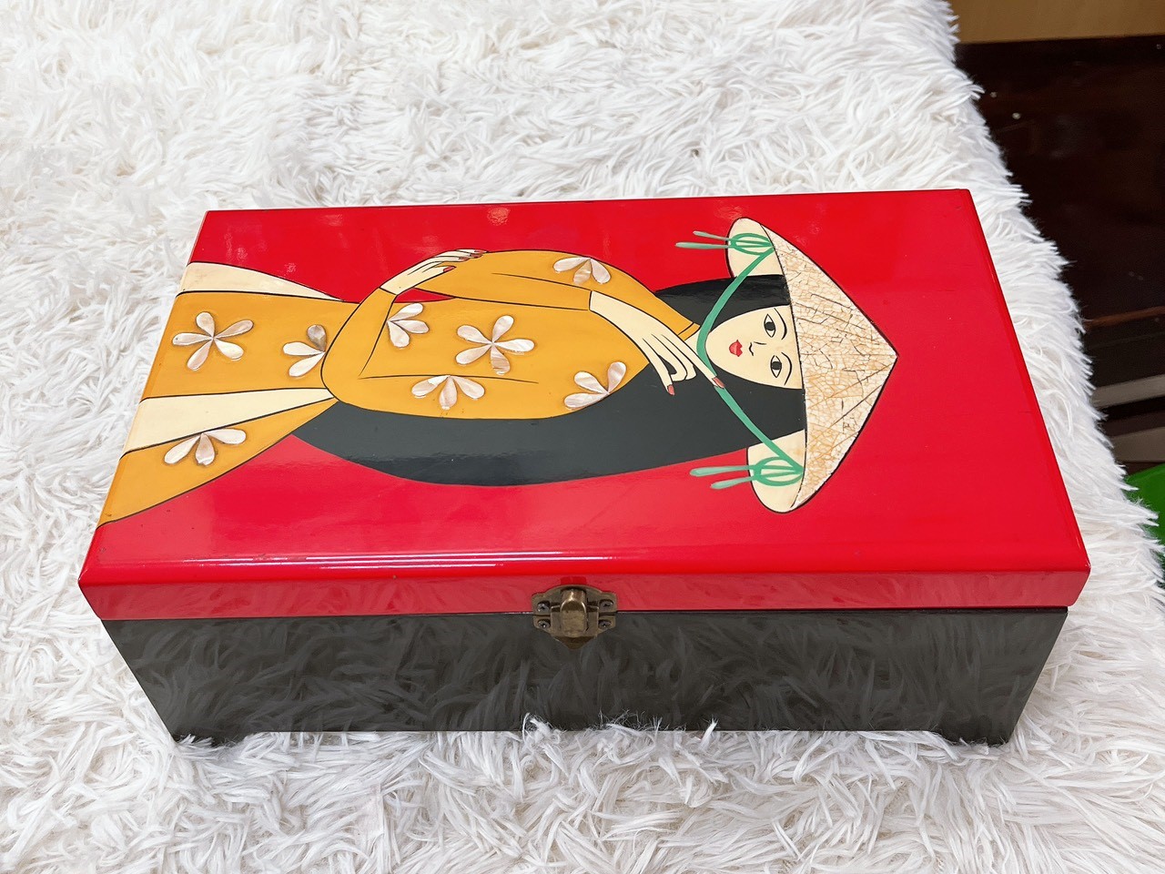 Hộp nữ trang sơn mài 2 tầng được chế tác hoàn toàn thủ công, kết hợp kỹ thuật sơn mài truyền thống và hoa văn vẽ tay tinh tế. Đây không chỉ là món phụ kiện tiện ích cho phái đẹp, mà còn là món quà nghệ thuật đậm chất văn hóa Việt.