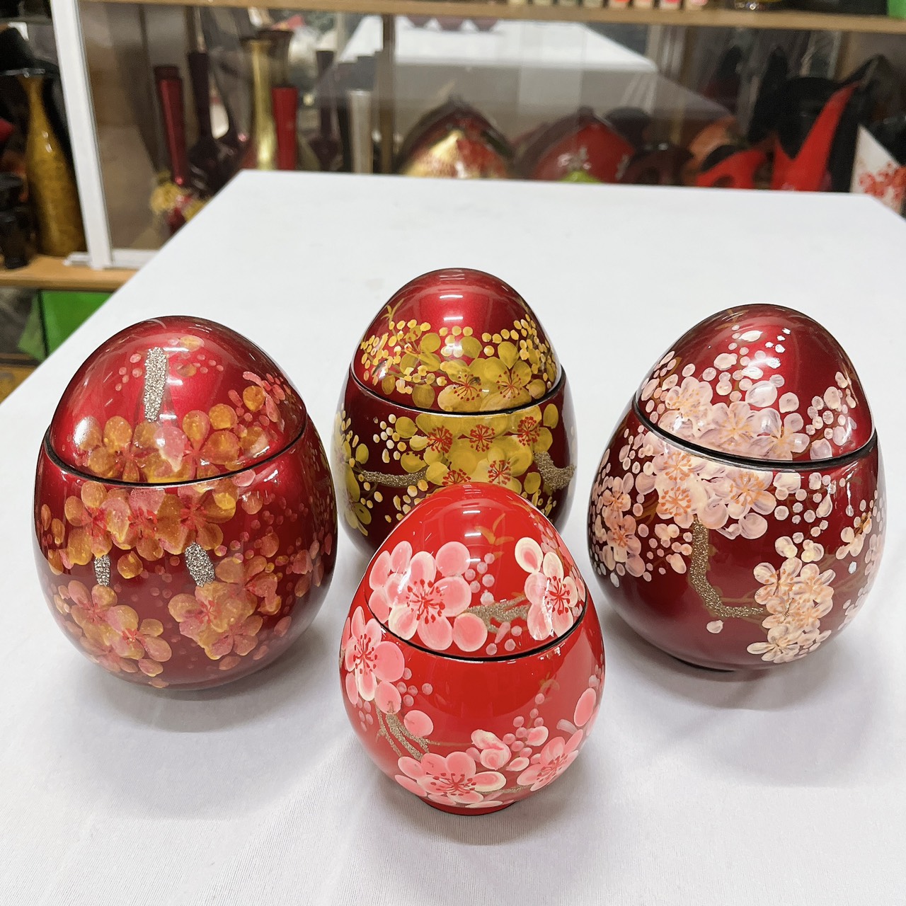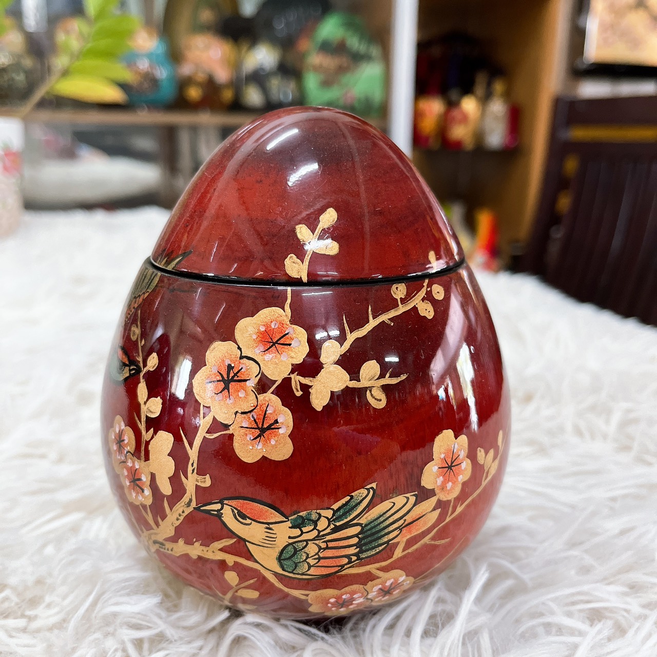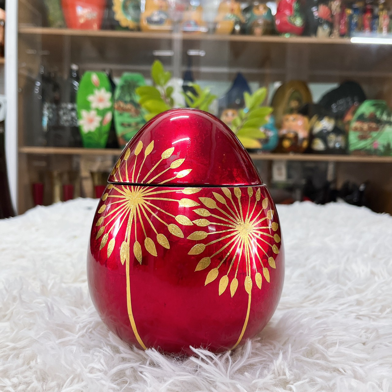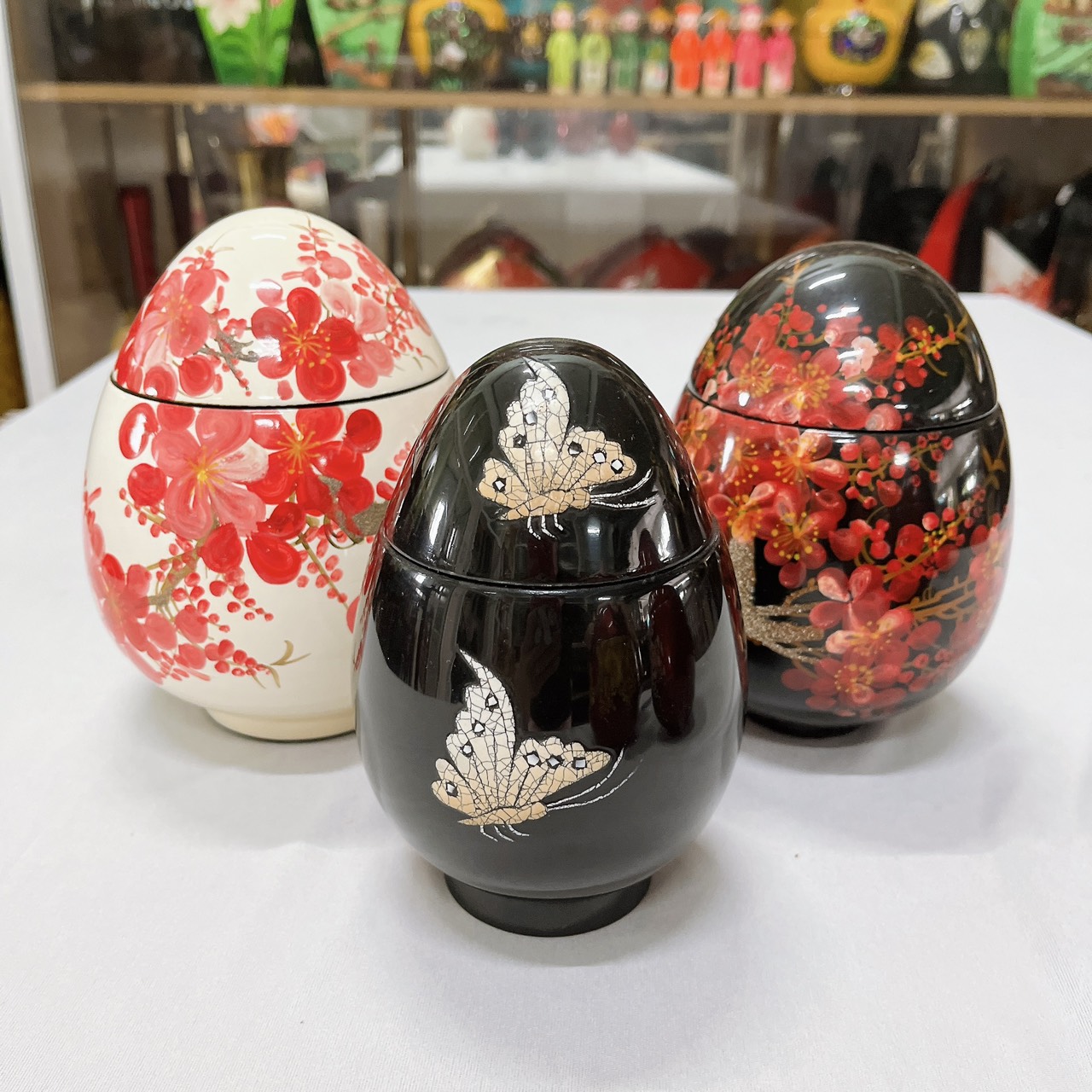 Hũ trứng sơn mài là sự kết hợp hoàn hảo giữa kỹ thuật sơn mài truyền thống và nghệ thuật vẽ tay hiện đại. Với thiết kế mềm mại, đầy tính thẩm mỹ cùng nhiều họa tiết đa dạng, sản phẩm không chỉ phục vụ nhu cầu sử dụng hàng ngày mà còn là điểm nhấn trang trí sang trọng cho không gian sống.