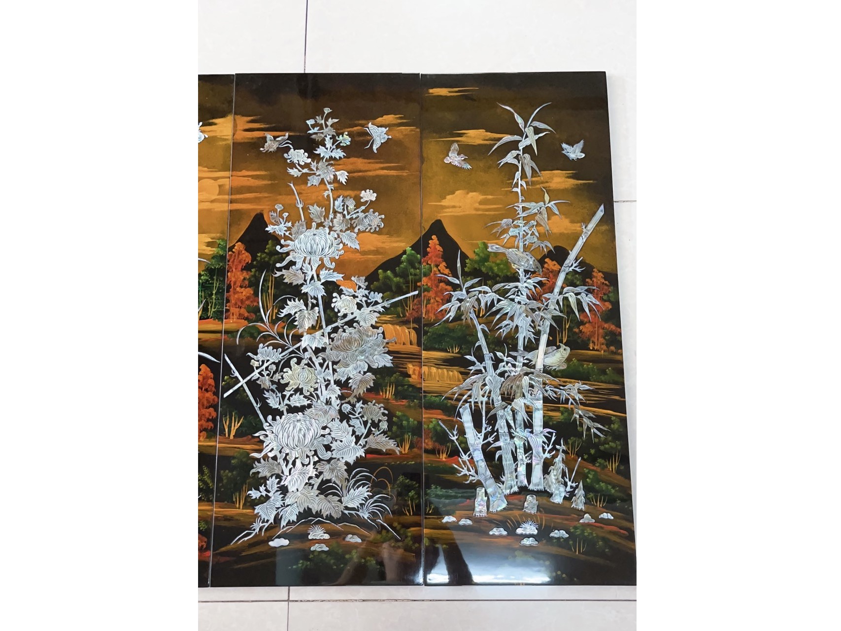 ✔️ 4 tấm tranh sơn mài khảm cừ – mỗi tấm size 30×80 cm