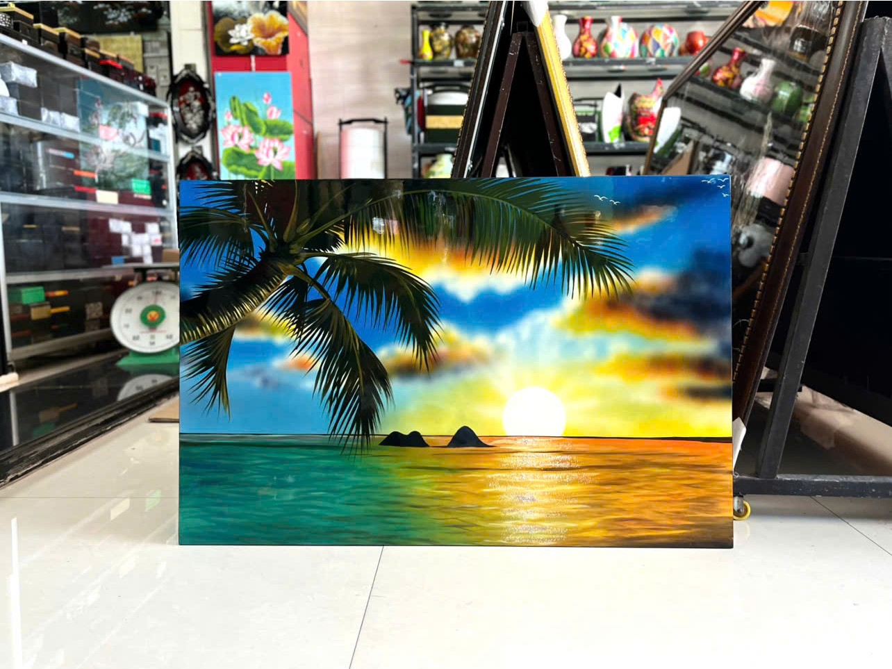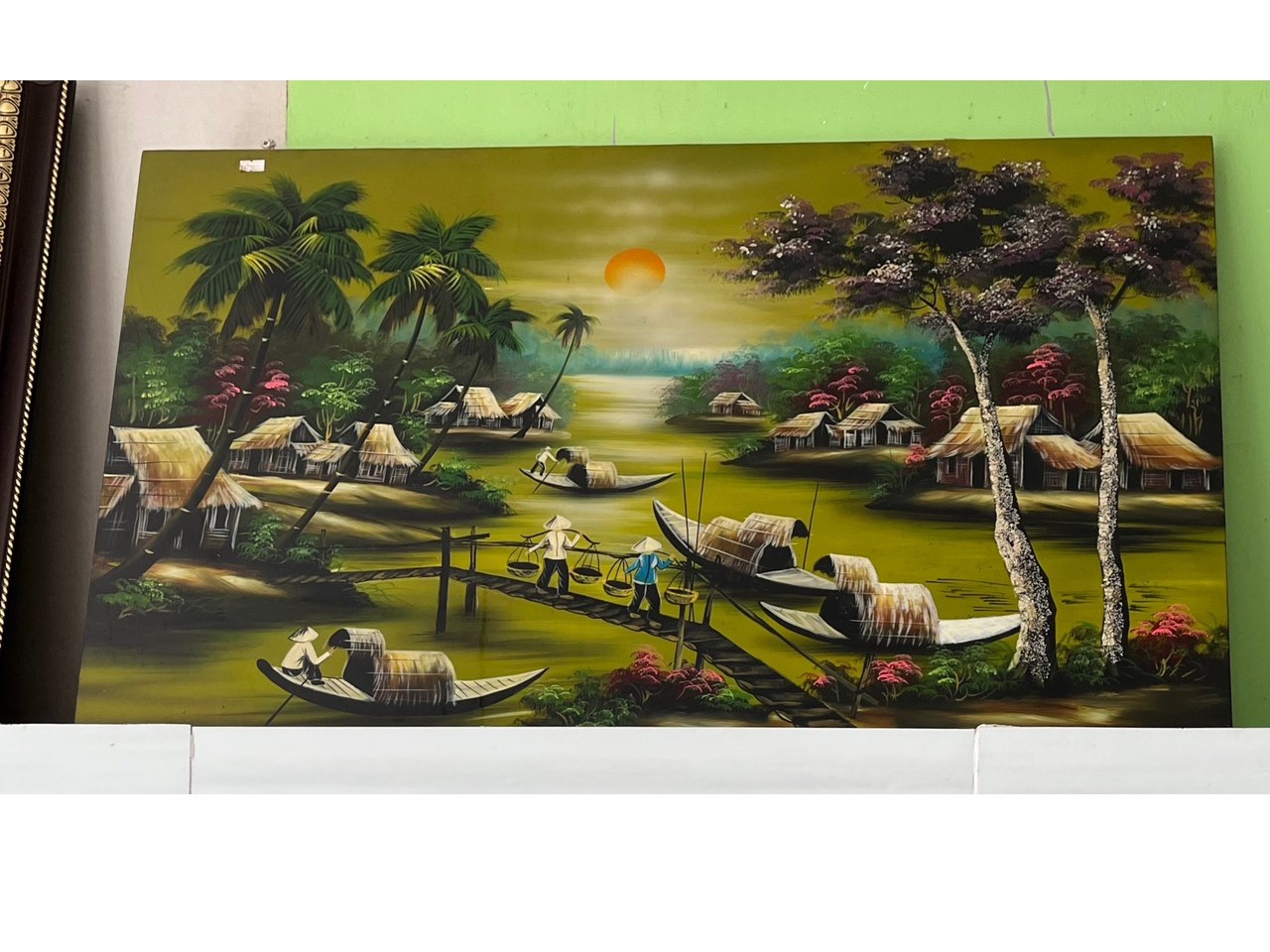 Kích thước: 60×90 cm – đủ lớn để làm điểm nhấn cho phòng khách, quán cà phê, phòng làm việc, nhà hàng mang phong cách Việt xưa…