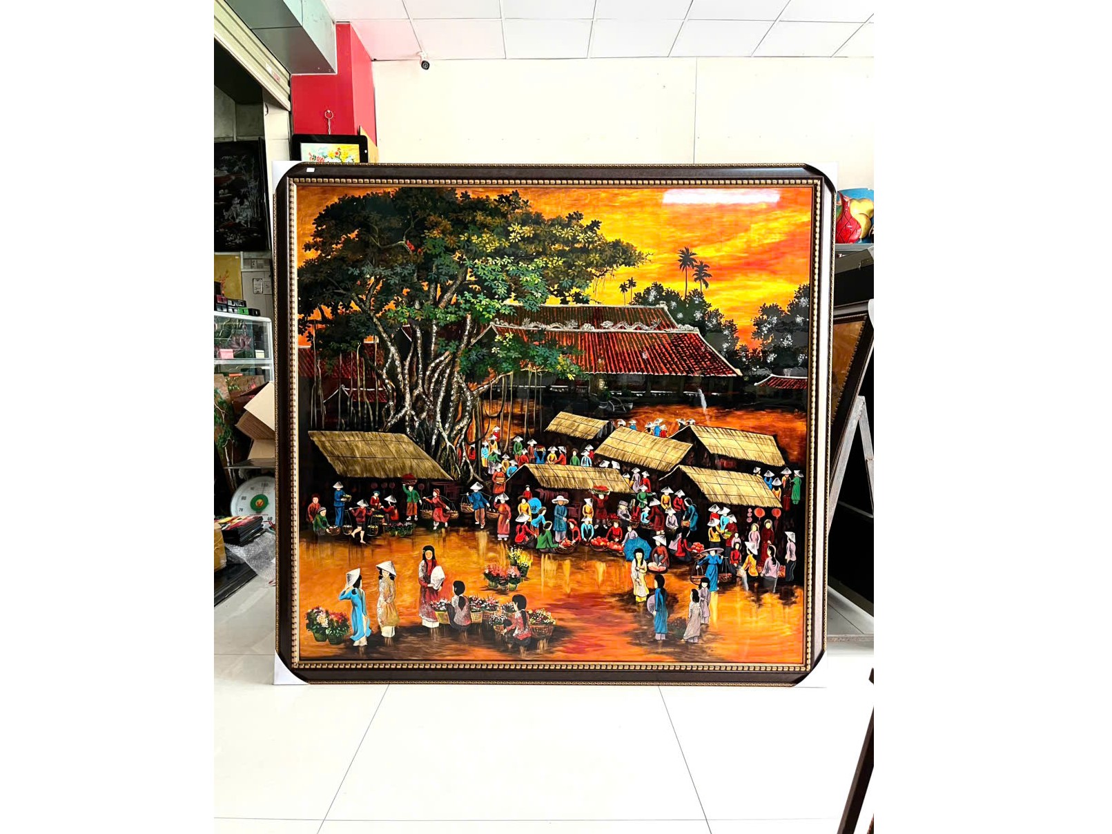 Tác phẩm sơn mài khổ lớn tái hiện chân thực và sinh động cảnh chợ quê Việt Nam xưa, với sắc cam hoàng hôn rực rỡ, hình ảnh cây đa – mái đình – những mái lá và người dân quê buôn bán tấp nập. Mỗi chi tiết trong tranh đều được vẽ thủ công tỉ mỉ, tạo nên không gian nghệ thuật vừa gần gũi vừa hoài niệm.